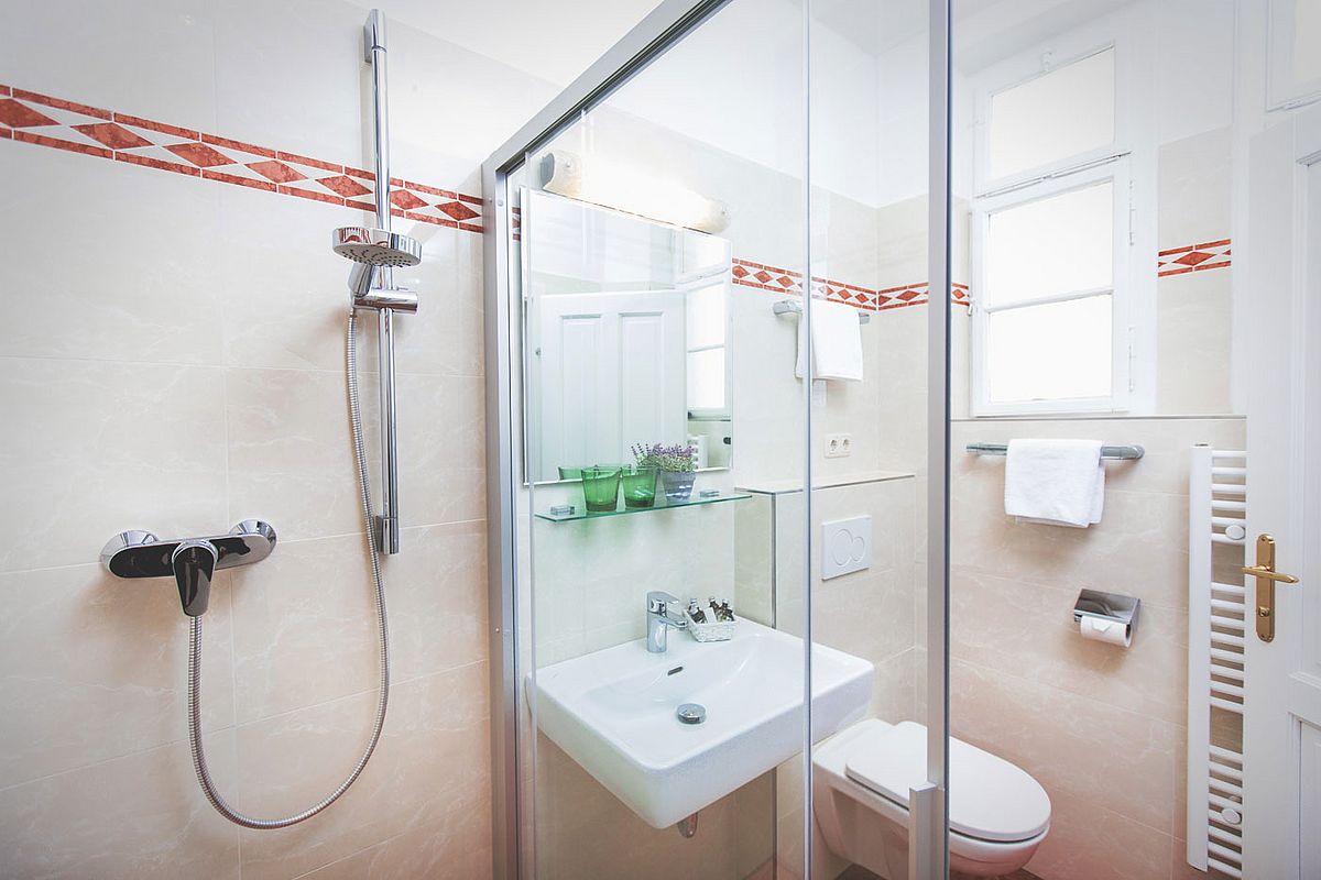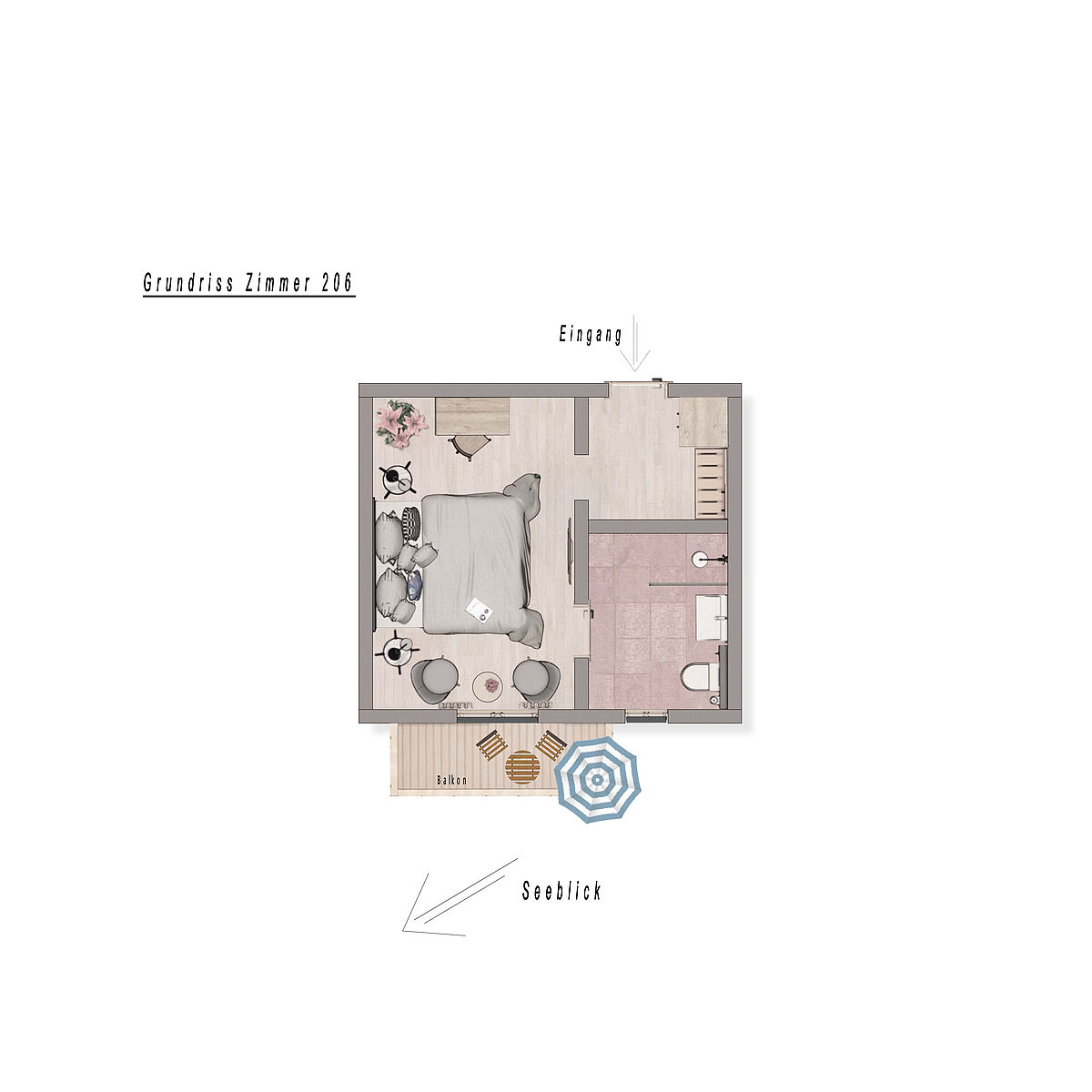 Das moderne Badezimmer mit walk-in Dusche rundet das stimmige Gesamtbild ab. Vom eigenen Balkon genießen Sie den Ausblick zum See – entspannter Komfort in ruhiger Atmosphäre.