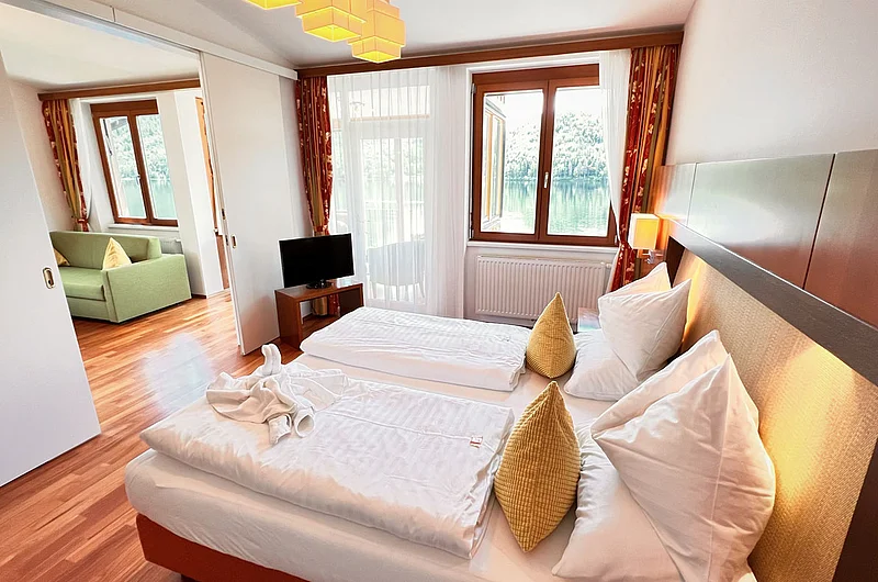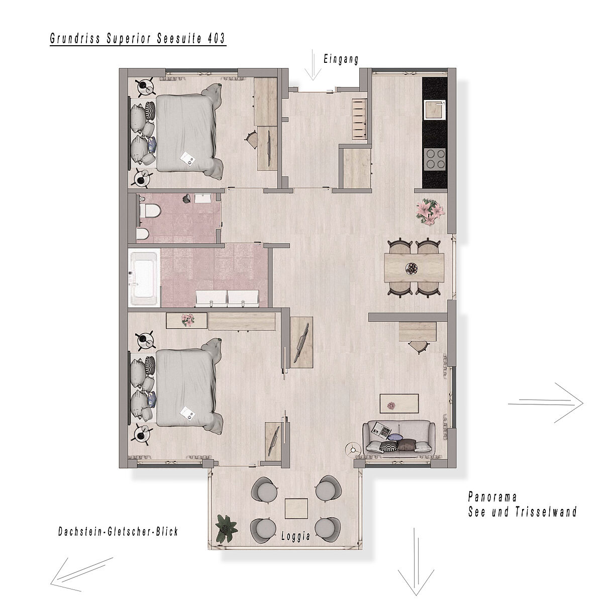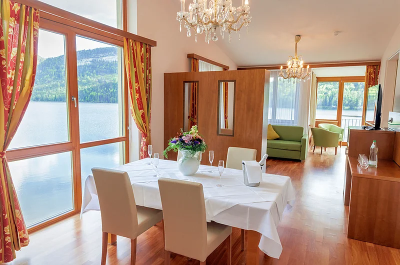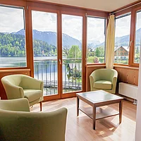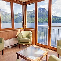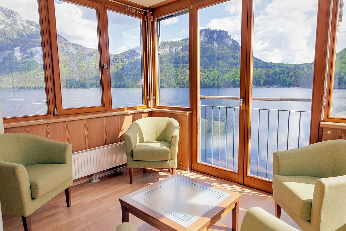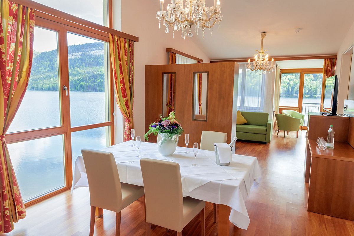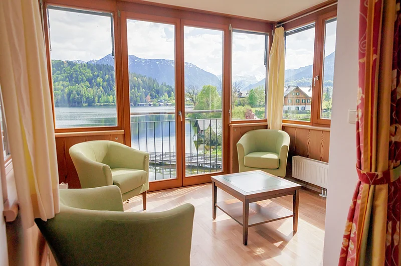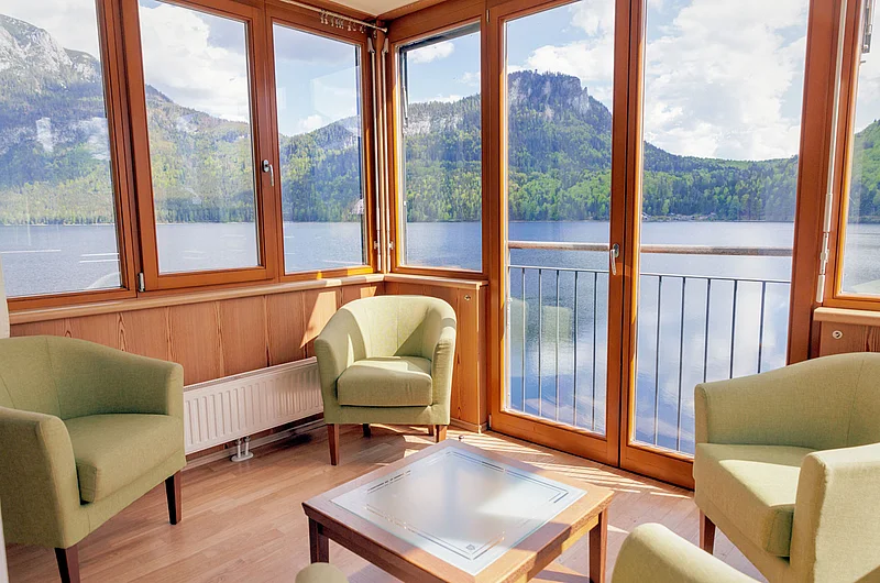 Ihre exklusive Suite auf ca. 90m² bietet großzügigen Wohnkomfort mit spektakulärem Panoramablick in bester Seelage. Der lichtdurchflutete Wohnraum mit Loggia und großzügiger Veranda eröffnet Ihnen einen unvergesslichen Ausblick über den gesamten See zum majestätischen Dachsteingletscher, zur imposanten Trisselwand und zum Tressenstein.