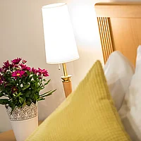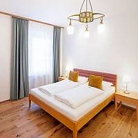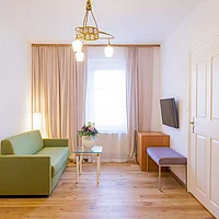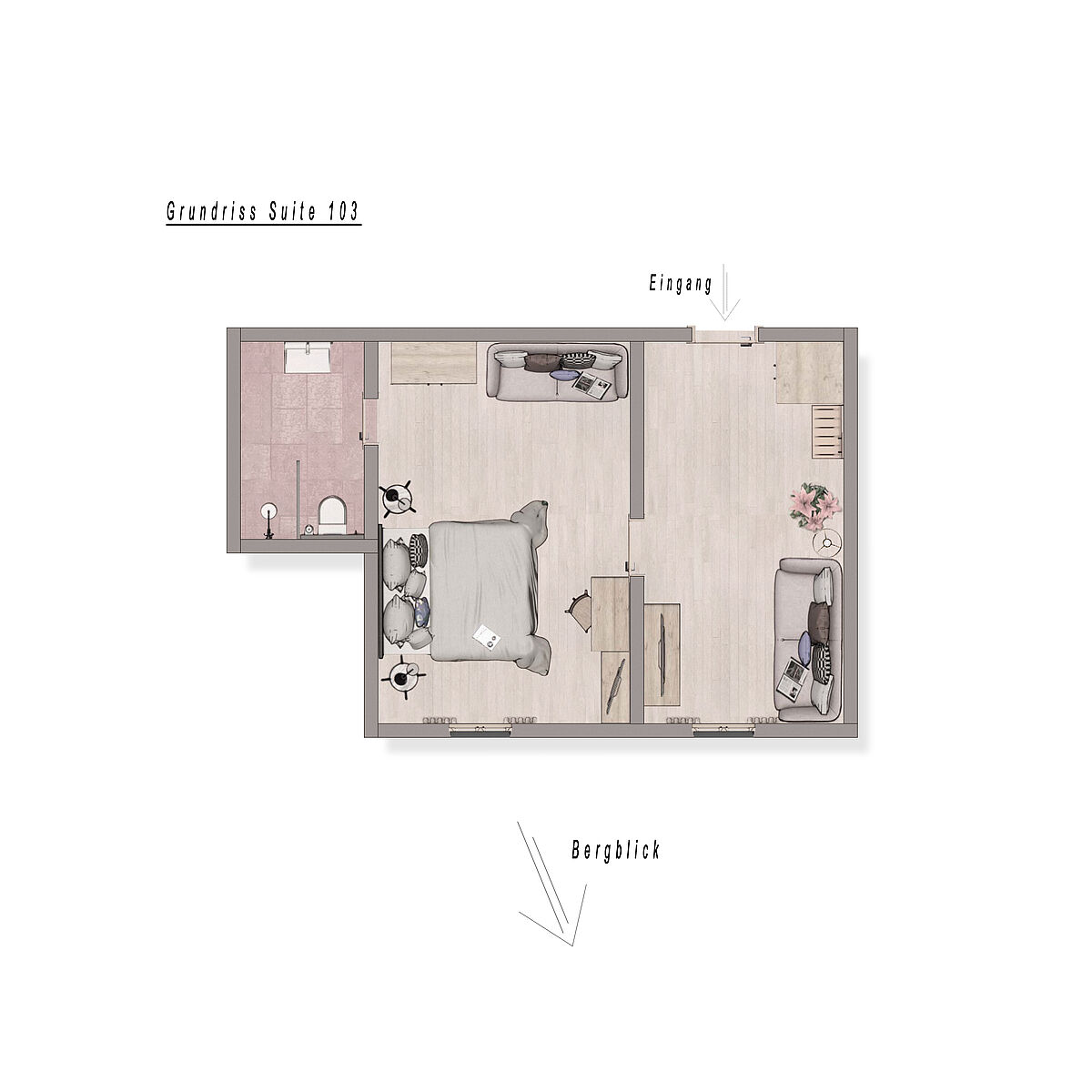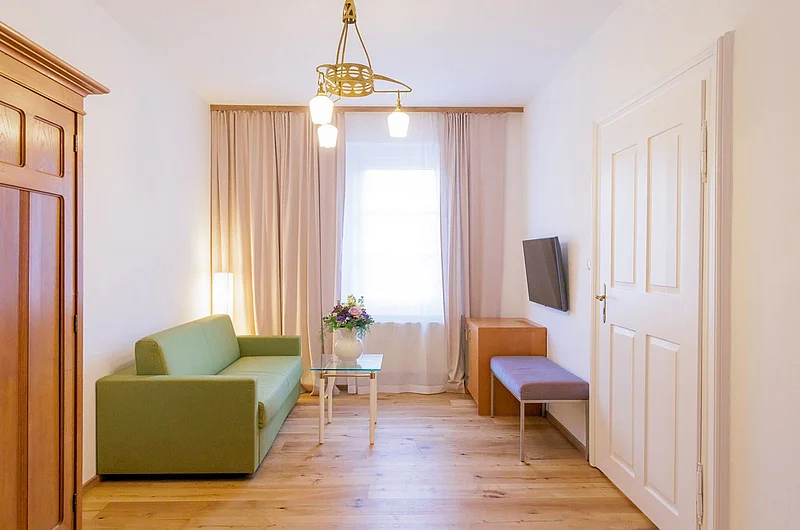 Ihre großzügige Suite bietet auf ca. 40m² ein stilvolles Rückzugsrefugium mit separatem Schlafzimmer und geräumigem Wohnbereich. Das komfortable Doppelbett mit ergonomischen Matratzen garantiert erholsamen Schlaf, während das Ausziehsofa im Wohnraum als vollwertiges zweites Bett mit hochwertiger Ergomatratze dient und Flexibilität für vier Personen bietet.
