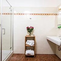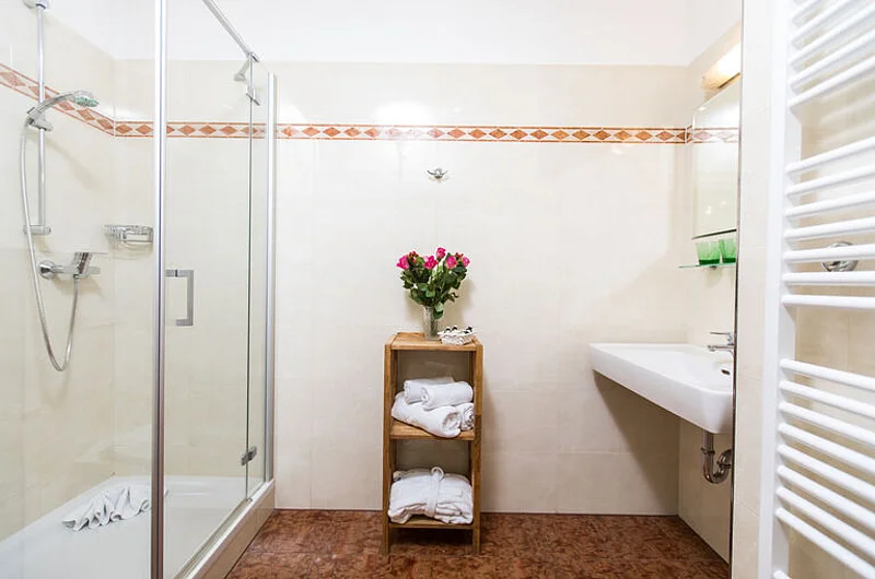Das elegante Marmorbadezimmer mit Dusche rundet das klassische Ambiente ab. Ideal für Familien oder Paare – zeitlose Eleganz trifft auf praktischen Komfort.