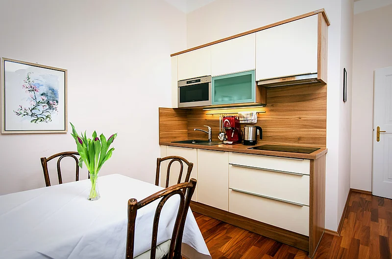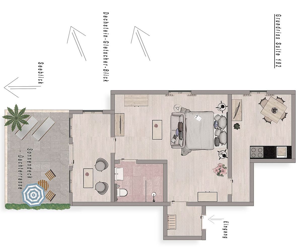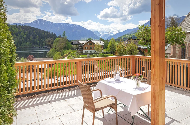 Die voll ausgestattete Küche gibt Ihnen kulinarische Unabhängigkeit – ideal für längere Aufenthalte. Ihre private Dachterrasse bietet spektakuläre Blicke auf den Altausseersee und den Dachsteingletscher.