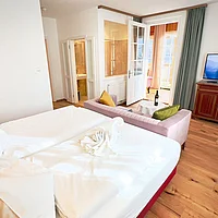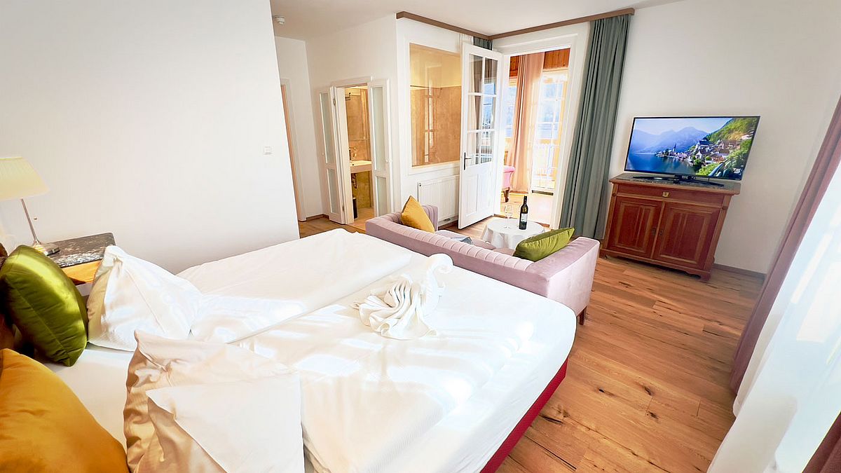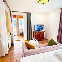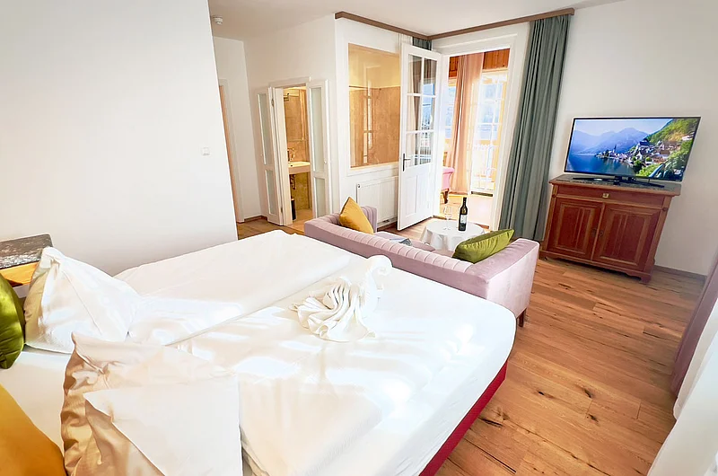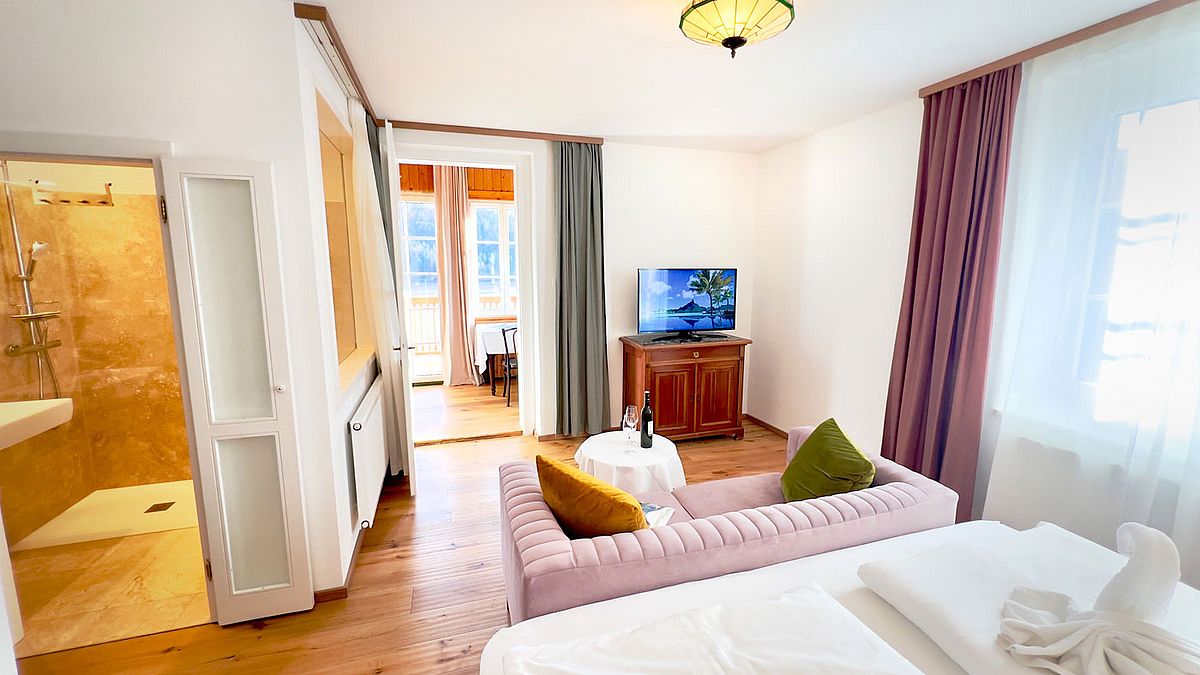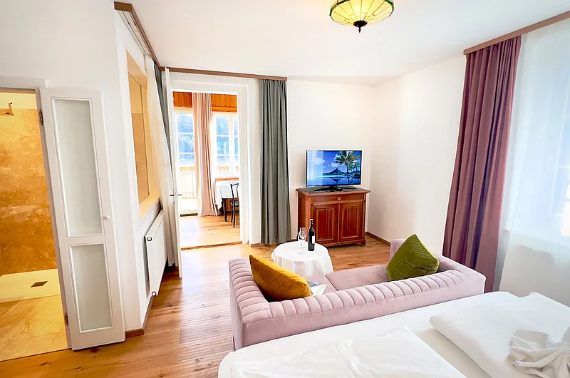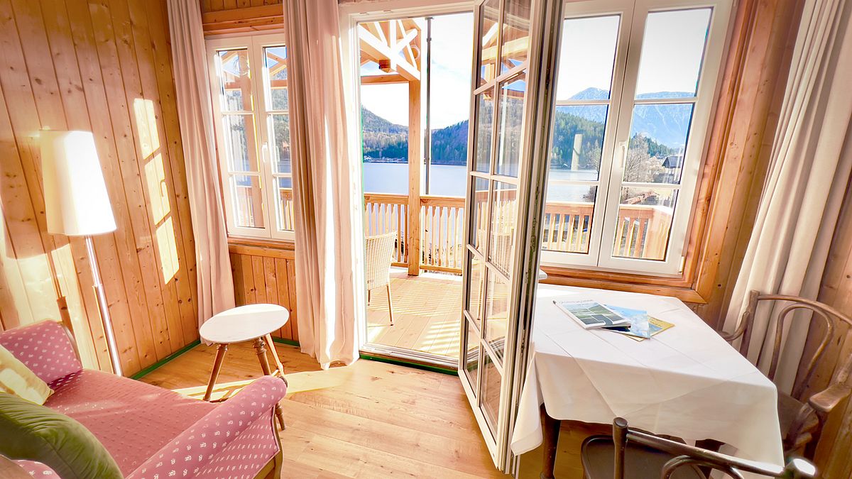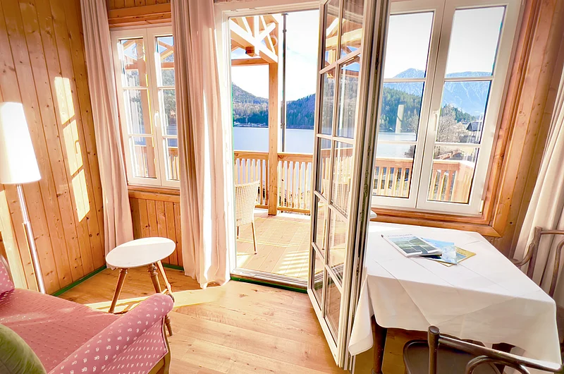 Ihre See-Suite mit vollausgestatteter Küche bietet auf ca. 50m² und einem privaten Balkon maximale Urlaubsfreiheit und Flexibilität. Die Suite vereint ein komfortables Doppelbett, eine gemütliche Sitzecke und eine original Ausser Wohnveranda, die sich zum privaten Balkon öffnet – alpiner Charme mit zeitloser Eleganz.