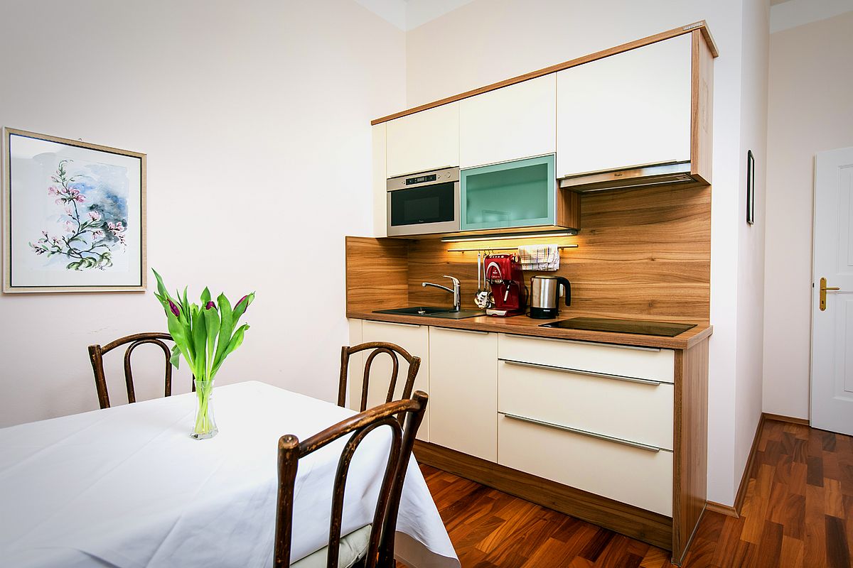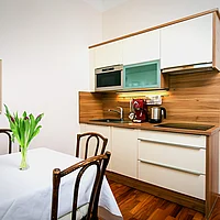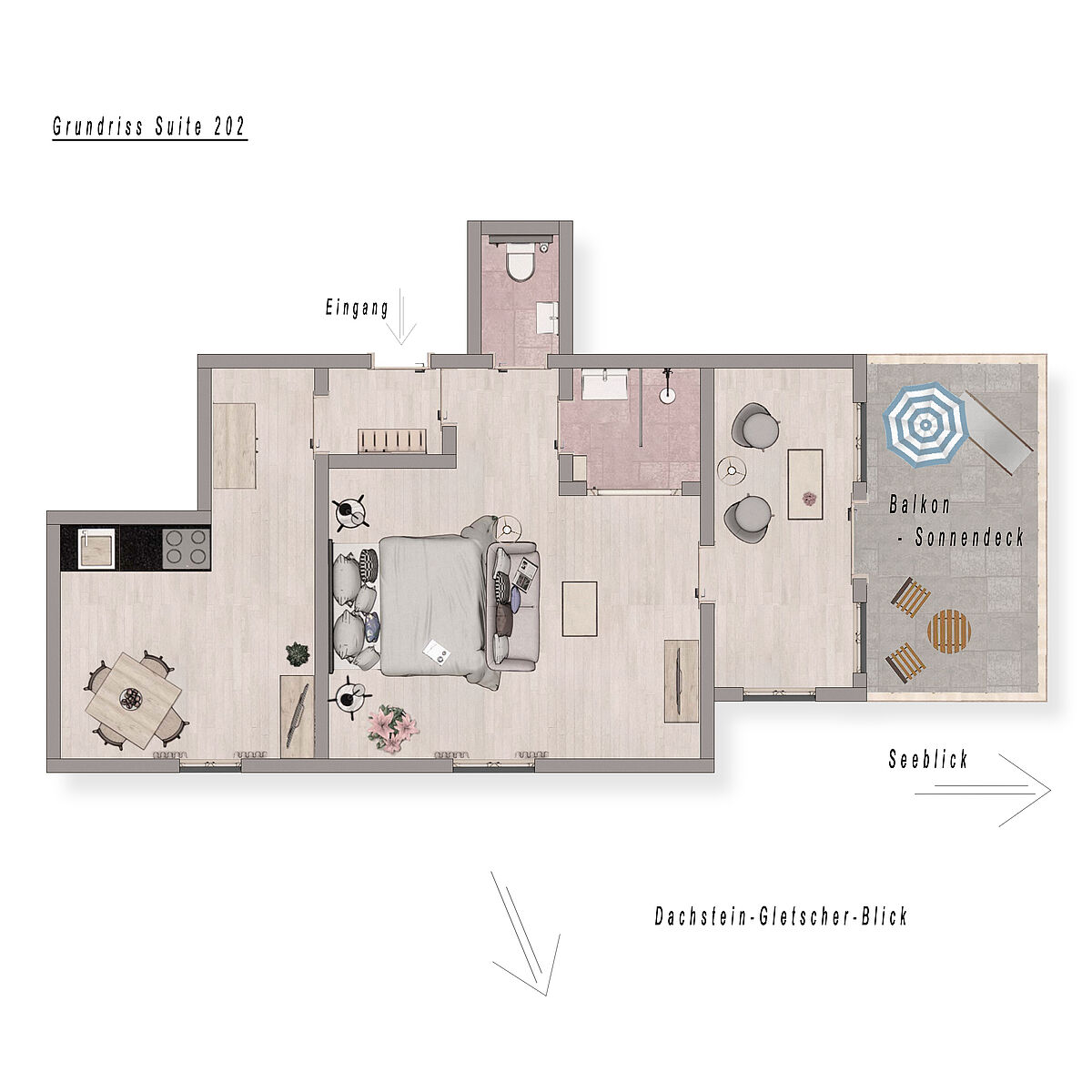 Die voll ausgestattete Küche ermöglicht Ihnen kulinarische Unabhängigkeit und ist ideal für längere Aufenthalte. Vom Balkon genießen Sie spektakuläre Blicke auf den See und den Dachsteingletscher.