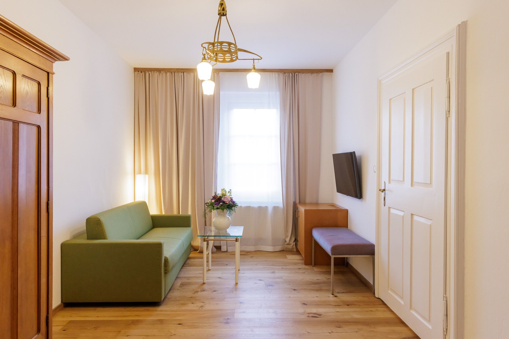 Suite ca. 40m² bestehend aus Schlafraum Doppelbett mit ergonomischen Matratzen, Minibarfreezer, großem Flat TV, Parkettboden - Marmorbadezimmer mit Dusche, Haartrockner & Kosmetikartikel, WC. Wohnraum mit Garderobe, Ausziehsofa auch als 2er Zusatzbett mit Ergomatratze verwendbar. Flat TV auch im Wohnraum. Das geräumige Urlaubsrefugium für 2 Personen oder gemütlich für bis zu 4 Personen , ideal für 2 Erwachsene und 2 Kinder.